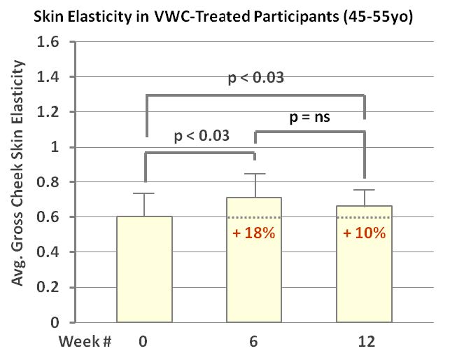 Hiệu quả được nhận thấy rõ ràng trong việc cải thiện độ đàn hồi da ở má (lên tới 18%) từ tuần thứ 6 trong nhóm có độ tuổi từ 45-55. Kết quả cho thấy rằng nhóm từ 55-60 tuổi phải sử dụng VWC Marigen collagen với thời gian lâu hơn để cho thấy hiệu quả cải thiện rõ rệt. Bên cạnh đó thì việc tăng cường hiệu quả của VWC Marigen collagen cũng được tìm thấy nếu bổ sung kết hợp với các loại thành phần khác như vitamin A, C, E, kẽm hay astaxanthin nhằm cải thiện tính đàn hồi của da nhanh hơn.