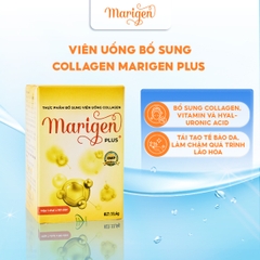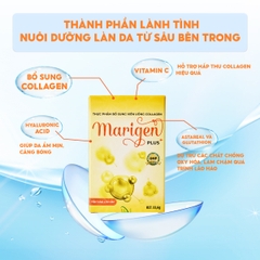 Thực phẩm bổ sung viên uống collagen Marigen Plus là sản phẩm có chứa Collagen thủy phân chiết xuất từ cá nước ngọt, Vitamin C, Hyaluronic Acid, Astareal, Glutathione và đạt chứng nhận GMP High Quality.