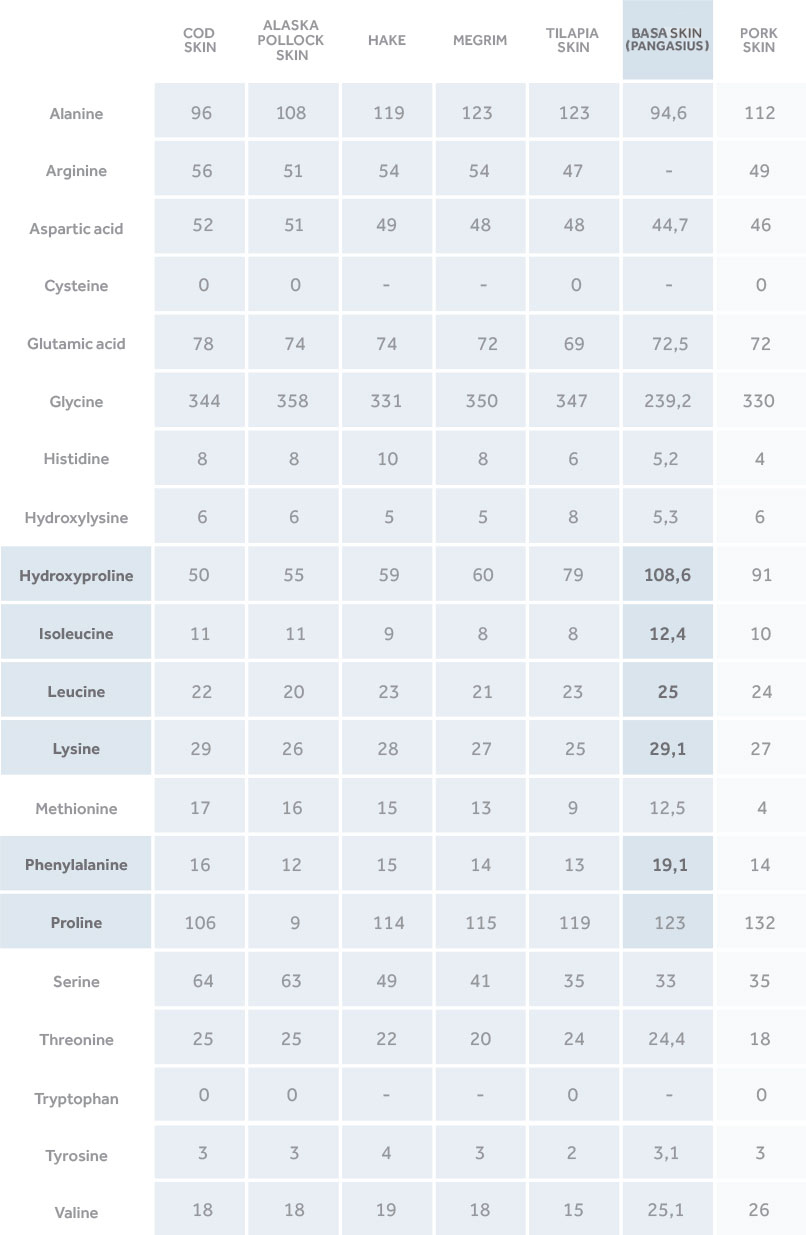 Hơn 50% thành phần amino acid trong các sản phẩm Marigen là Proline, Glycine, và Hydroxyproline; bên cạnh đó thì hàm lượng các amino acid cần thiết khác cho cơ thể cũng cao hơn các sản phẩm collagen cùng loại được sản xuất từ các loài động vật khác như Isoleucine, Leucine, Lysine, Phenylalanine theo một nghiên cứu khoa học được công bố vào 2009 của Karim và cộng sự trên tạp chí khoa học quốc tế Food Hydrocolloids.