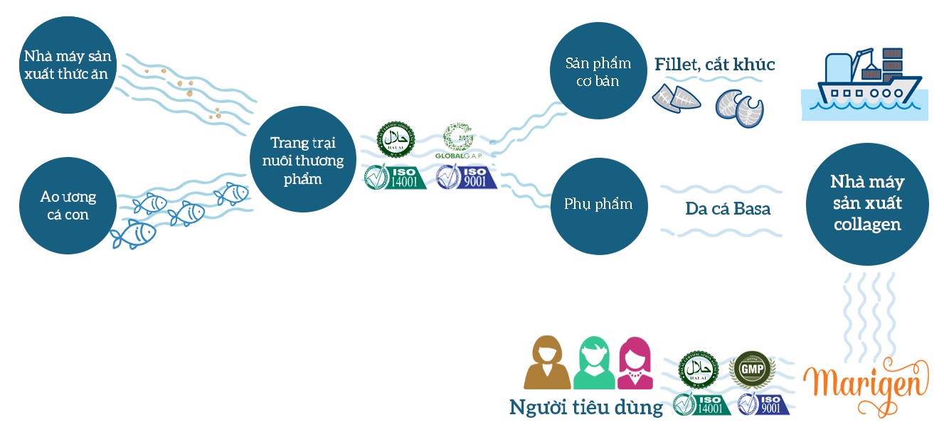 Nguồn nguyên liệu da cá Basa nước ngọt dùng để sản xuất ra các sản phẩm collagen thủy phân của Marigen được dùng từ các trang trại nuôi cá Basa của công ty cổ phần Vĩnh Hoàn - một tập đoàn đầu ngành trong nuôi trồng và chế biến cá Basa xuất khẩu tới các thị trường khó tính như Mỹ, Nhật và Châu Âu. Các trang trại nuôi cá Basa này phải tuân thủ theo các quy định nghiêm ngặt của các tổ chức chứng nhận uy tín của thế giới như Global Gap, Aquaculture Stewardship Council (ASC) - tiêu chuẩn phổ biến tại Châu Âu và các tiêu chuẩn khắt khe trong nhà máy chế biến collagen như International Food Standard (IFS), tiêu chuẩn về chất lượng (ISO 9001), tiêu chuẩn về việc kiểm soát môi trường trong quá trình sản xuất (ISO 14001) hay tiêu chuẩn đặc biệt giành cho người theo đạo Hồi như Halal. Bên cạnh đó còn có tiêu chuẩn Good Manufacturer Practices (GMP) - đánh giá và chứng nhận cho các hoạt động sản xuất và lưu trữ hàng bởi tổ chức thế giới WHO