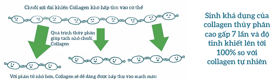 Collagen thủy phân (hydrolyzed collagen) được sản xuất từ collagen có trong xương, da và các mô liên kết của các loài động vật như cá, heo, bò, gà và một số loài khác. Công nghệ thủy phân giúp chia nhỏ thành phần collagen thành các phân tử siêu nhỏ (1000-3000 DA) có cấu trúc phân tử chỉ bằng 1/60 collagen tự nhiên. Nếu Collagen tự nhiên sau khi vào đến dạ dày phải đợi thủy phân bởi quá trình tiêu hóa thông thường để đạt cấu trúc phân tử nhỏ hơn, sau đó mới được hấp thụ vào cơ thể; thì collagen thủy phân bỏ qua bước thủy phân và giúp đẩy nhanh quá trình hấp thụ vào cơ thể gấp 7 lần so với collagen tự nhiên (hay còn gọi sinh khả dụng của collagen thủy phân). Collagen sau khi thủy phân có độ tập trung dưỡng chất cao và tinh khiết lên tới 100%.