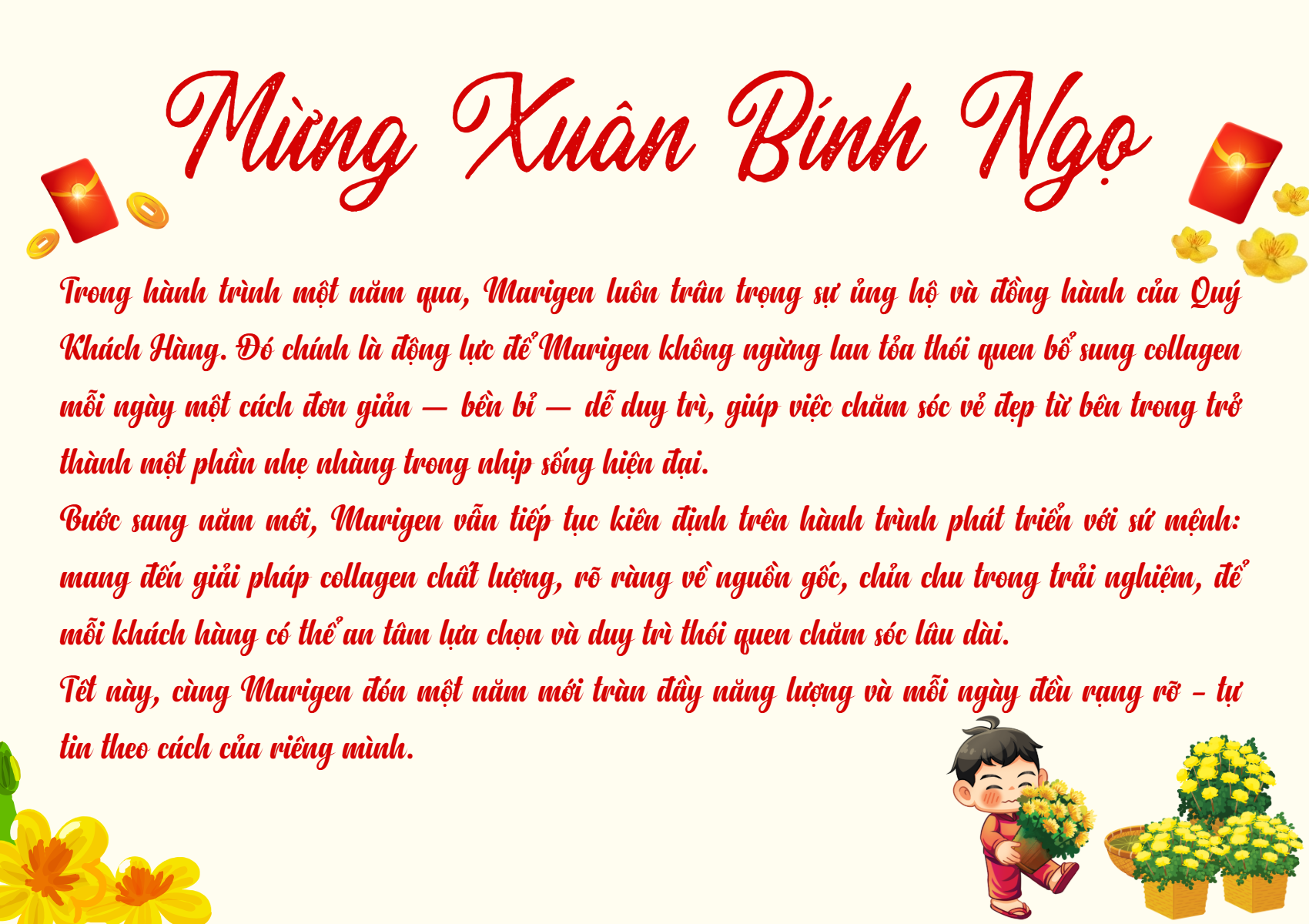 Nhân dịp Tết đến Xuân về, MARIGEN xin gửi lời chúc An Khang Thịnh Vượng, Vạn Sự Như Ý đến Quý đối tác, khách hàng và toàn thể đội ngũ nhân viên. Cảm ơn sự tin tưởng và đồng hành...